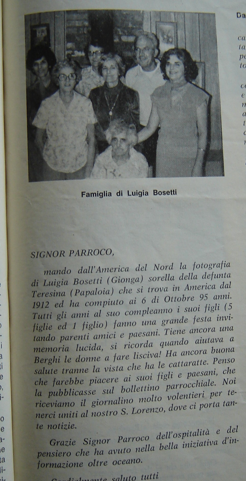 Tre settimane dopo la sua morte, ero su un volo per Milano per riscoprire le mie radici a San Lorenzo. Al mio arrivo in paese, ho iniziato a parlare con i paesani del mio scopo e delle mie origini. Mi hanno subito accolto e hanno cominciato ad aiutarmi nelle mie ricerche genealogiche. I paesani mi hanno presentato Sandro, un insegnante in pensione, che conosceva la storia di ogni famiglia del paese. Mi ha aiutato a visualizzare i documenti genealogici della mia famiglia nella canonica. Il giorno dopo mi ha detto che la cugina di mia nonna voleva incontrarmi. Accompagnato da Sandro, ho incontrato a casa sua Modesta, la figlia del fratello del mio bisnonno. Dopo aver chiacchierato per qualche minuto, ha mostrato alcune fotografie del suo viaggio in Pennsylvania. Una fotografia era lei con mia nonna Anna un anno prima della mia nascita. Più tardi, Modesta ha parlato di suo padre, Modesto, rimasto ucciso in un incidente durante il taglio di un albero. Il parente era il padre di Modesta! Prima di partire per Milano, Sandro mi ha regalato una copia del bollettino parrocchiale, in cui era pubblicato un articolo sul 95esimo compleanno della bisnonna a Pittsburgh.